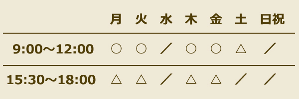 | 駐車場について | 当院駐車場は数に限りがございます。満車の場合はお時間をあけてご来院ください。道路への駐車は近隣の方へのご迷惑となりますのでご遠慮ください。 |
